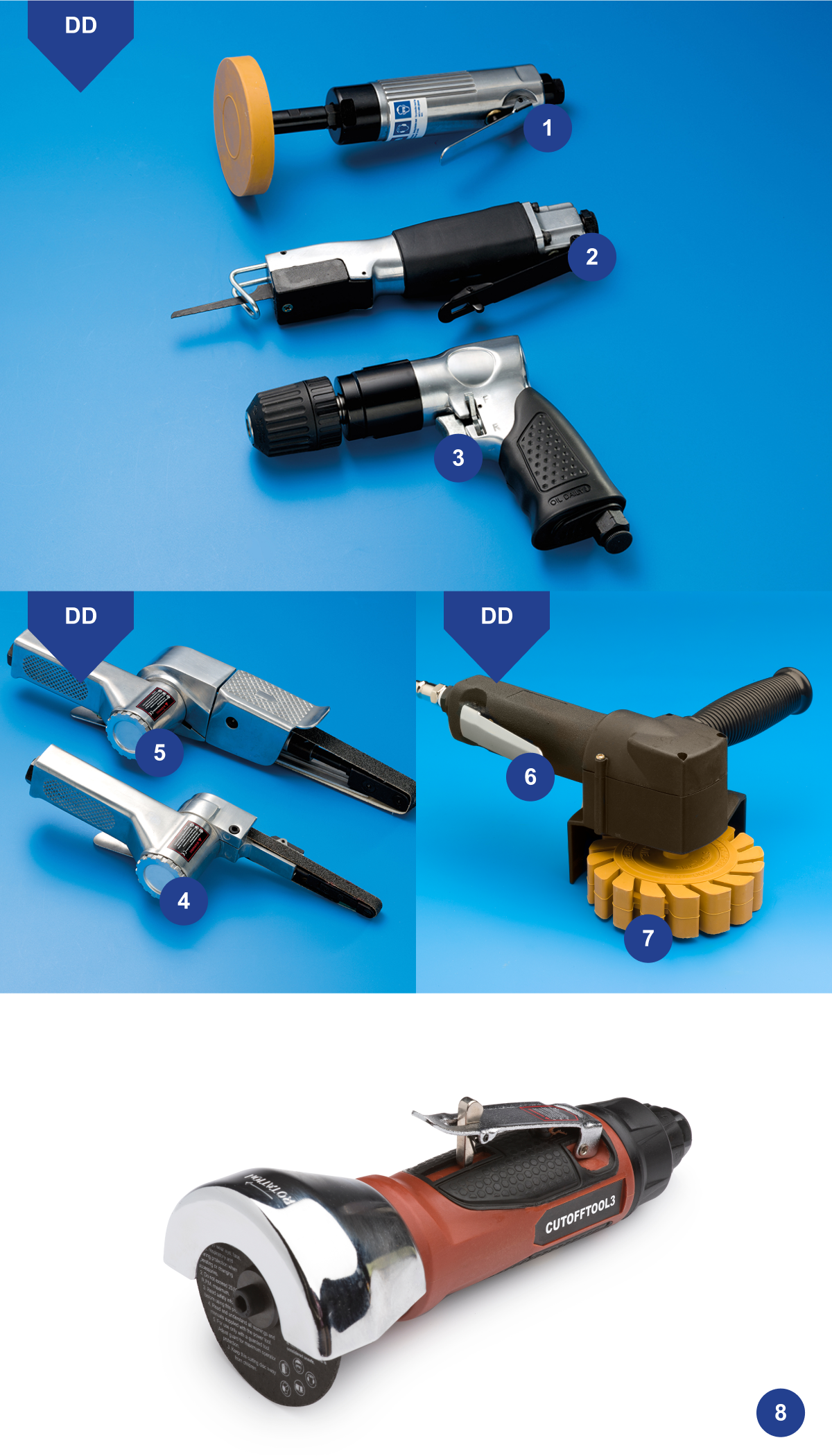 Eine Auswahl an Druckluftwerkzeugen, die bei der Aufkleberentfernung, Rostentfernung, und dem Bohren helfen.