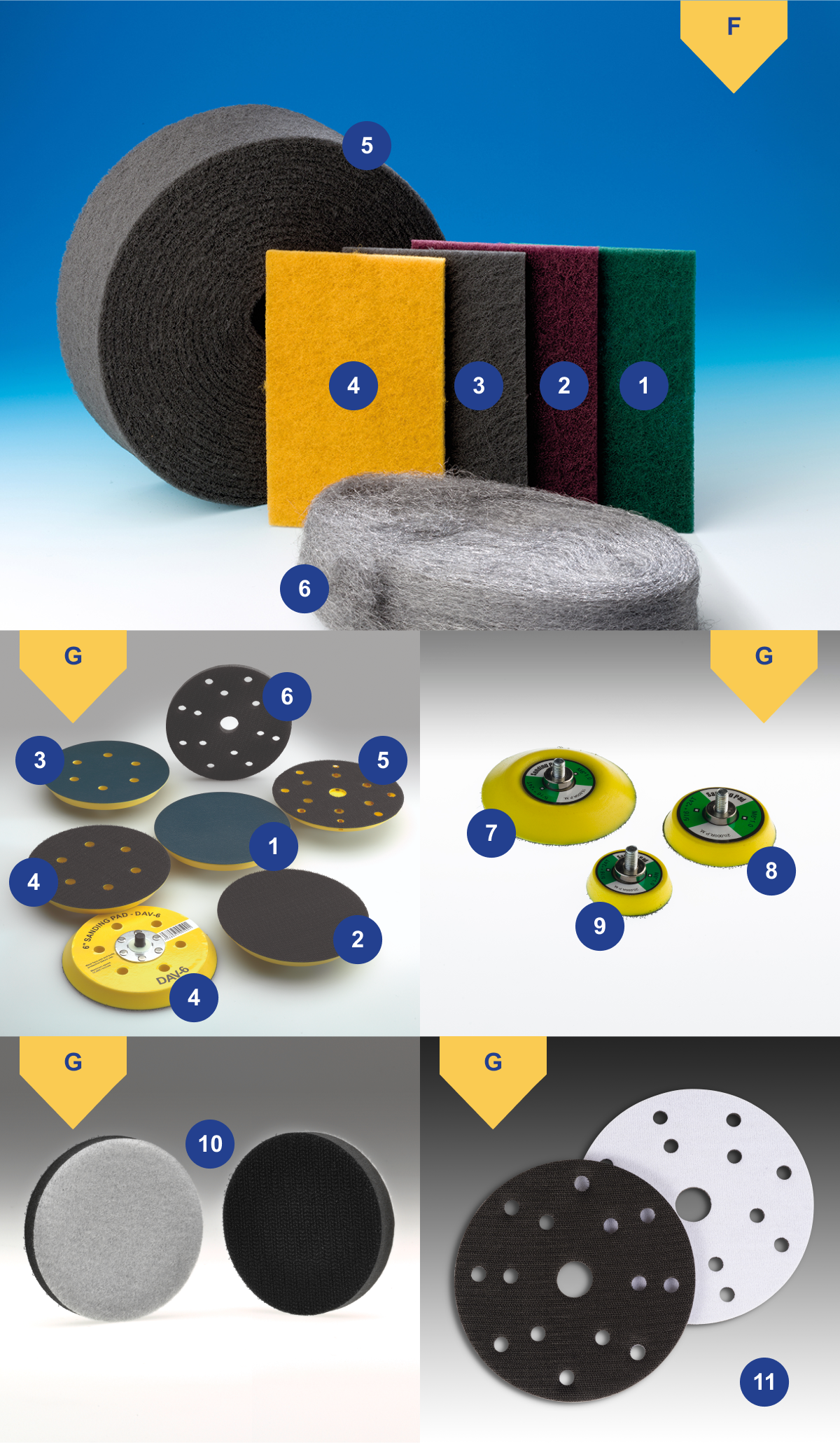 Für das Schleifen und die Rostentfernung haben wir eine Auswahl an Schleif- und Polierpads in verscheiden Körnungen, wie auch die Stahlwolle. Eine Auswahl an Schleiftellern in verschiedenen Größen, sowie Interface Pads in zwei Dichten.