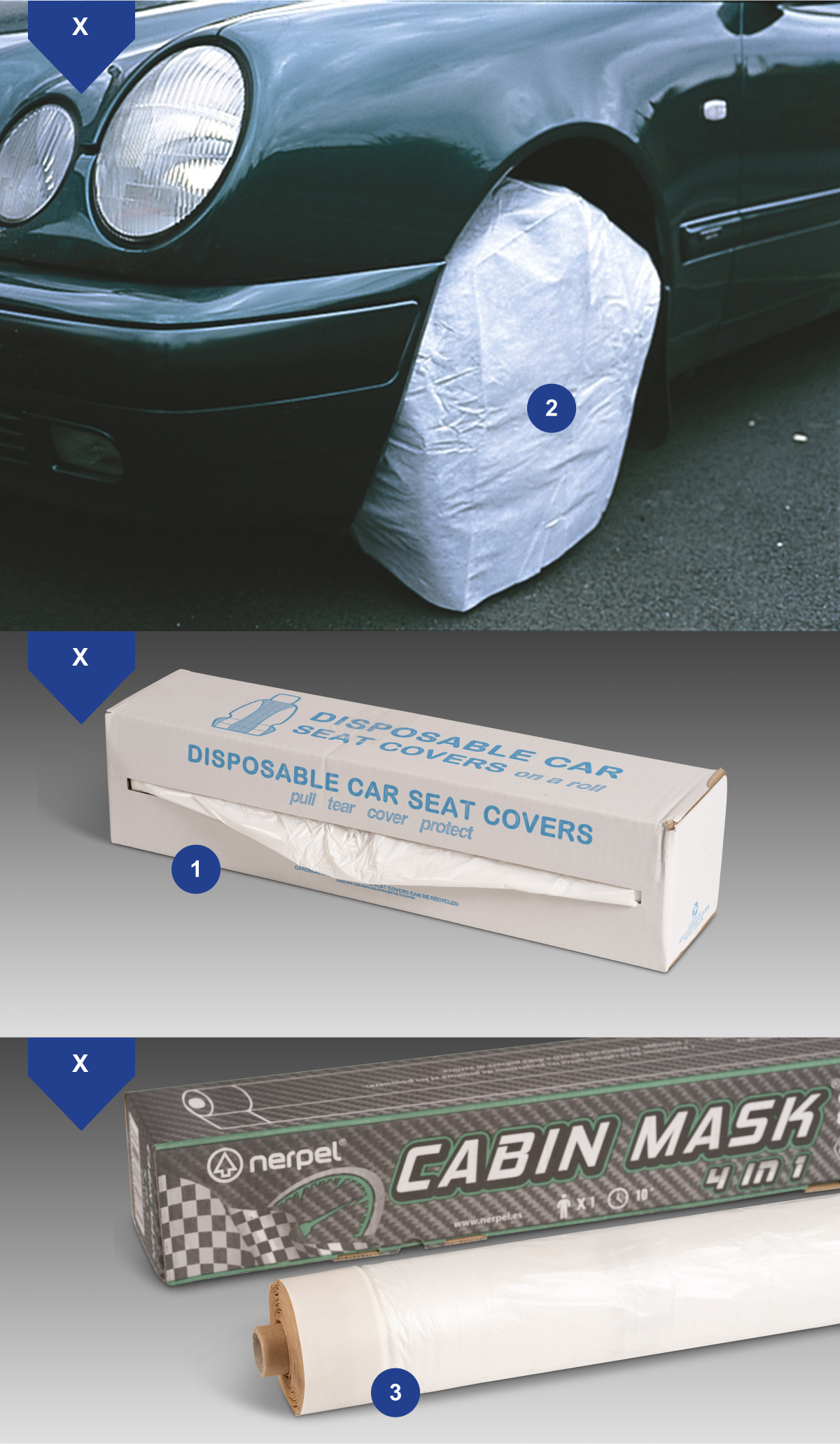 Une variété de protections pour l'intérieur et l'extérieur de votre véhicule. Masquez l'intégralité de votre cabine de peinture avec notre masque de cabine 4 en 1 pour protéger vos murs des éclaboussures de peinture.