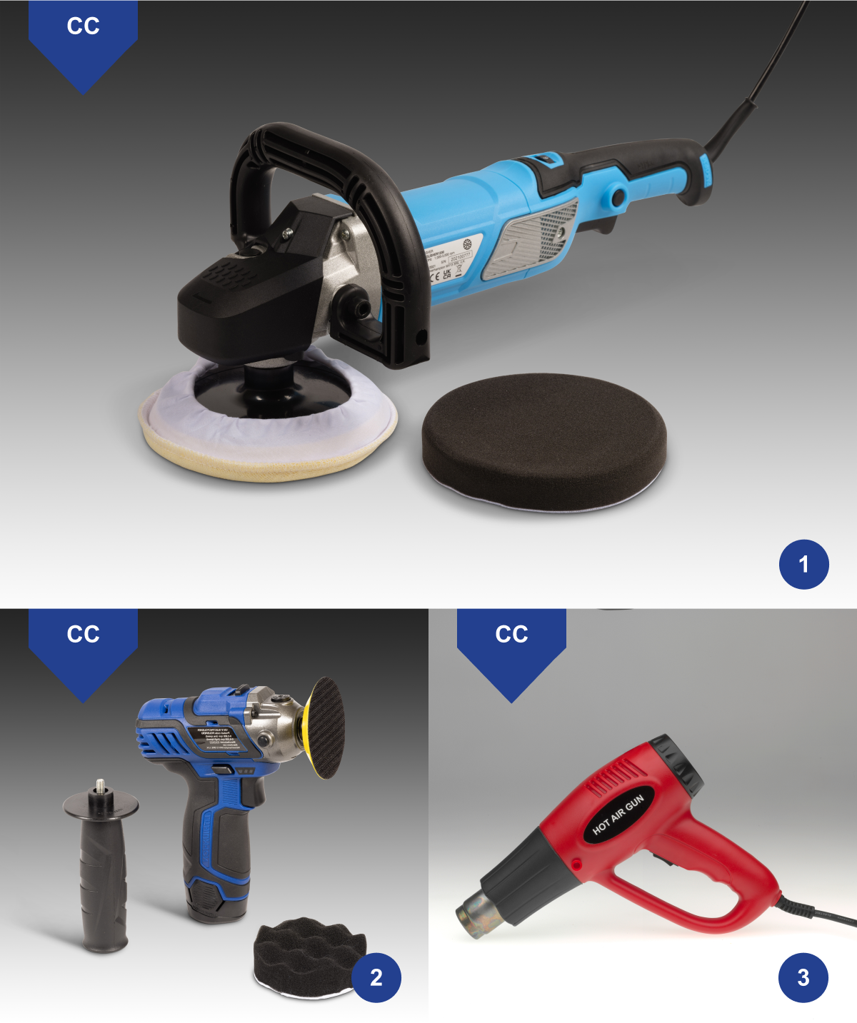 Choisissez parmi notre polisseuse électrique traditionnelle pour des plus grandes surfaces, ou une polisseuse sans fil 12 V pour les tâches petits. Un pistolet à air chaud électrique est aussi disponible pour aider à enlever les décalcomanies.