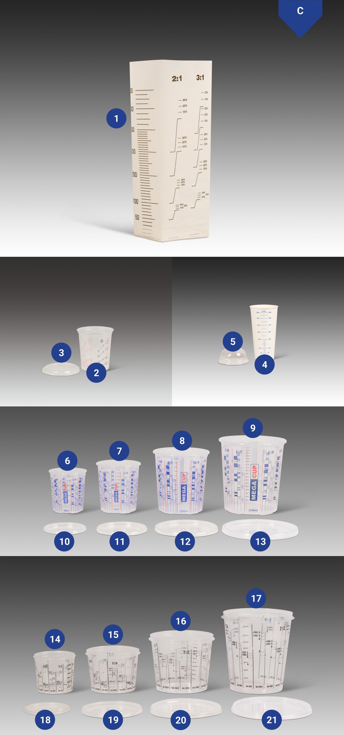 Lackmischbecher aus Pappe und Polypropylen von verschiedenen Größen. Deckeln sind auch verfügbar. De Luxe MEGACUP Messlackmischbecher mit Skala bis zu 12:1