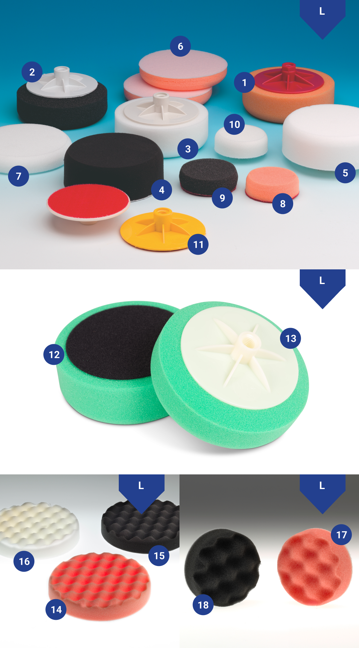 A selection of polishing and compounding heads in different sizes, hardness and thickness, with fast-fit or 14mm thread.