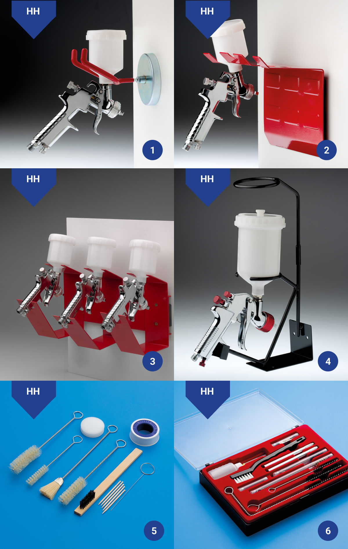 Se encuentran disponibles soportes magnéticos para pistolas de gravedad para alojar de 1 a 3 pistolas, así como kits de limpieza de pistolas.