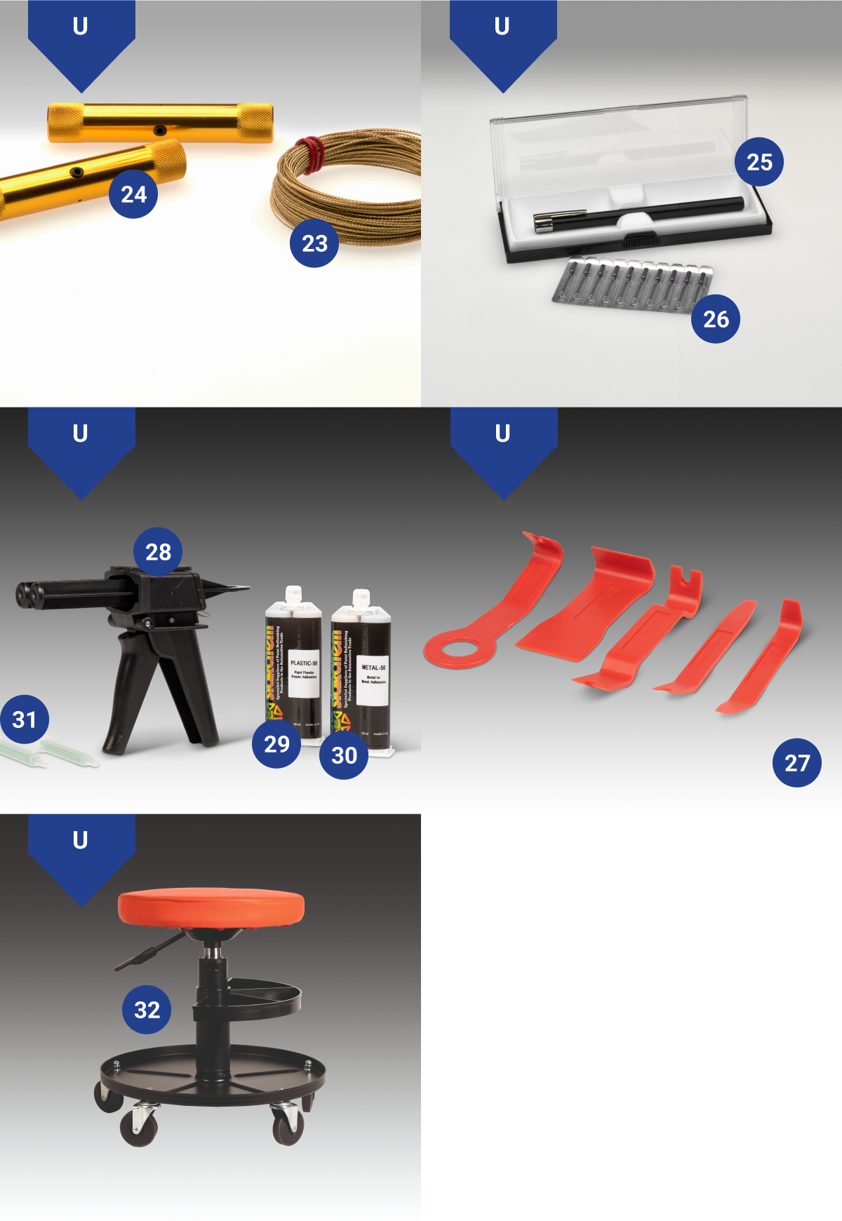 Más productos para el taller de carrocería, incluidas pequeñas herramientas para ayudar a eliminar la suciedad de la pintura y a quitar parabrisas, 2K adhesivos y un asiento con ruedas.